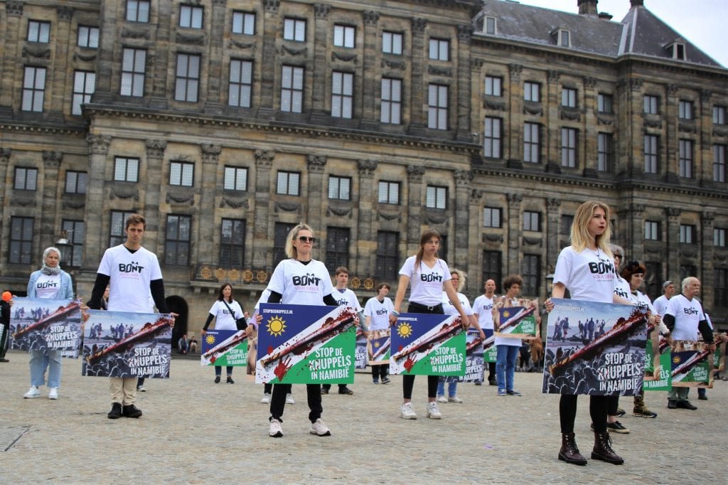 Maar weinig mensen weten dat er tussen juli en half november op brute wijze tot 86.000 Kaapse pelsrobben mogen worden doodgeknuppeld voor hun vacht. Ook is het onbekend dat Namibië 300 procent meer inkomsten zou genereren uit zeehondentoerisme dan uit de bontindustrie. Aan de hand van deze kennis verstuurde iedereen met wie wij in gesprek gingen onze protestmail, bedoeld voor het Namibische Ministerie van Visserij om voor eens en altijd te stoppen met de jacht. Deze mensen konden vervolgens op de foto met een protestbord met de tekst ‘Ook ik ben tegen de knuppels in Namibië’.